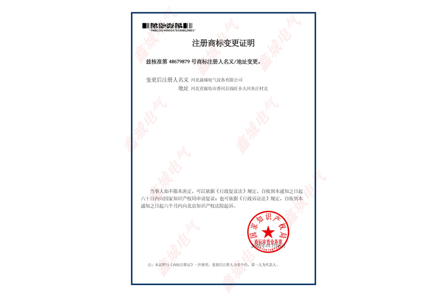 資質(zhì)榮譽(yù) 當(dāng)前位置:首頁 > 資質(zhì)榮譽(yù) > 鑫城電氣 注冊商標(biāo)